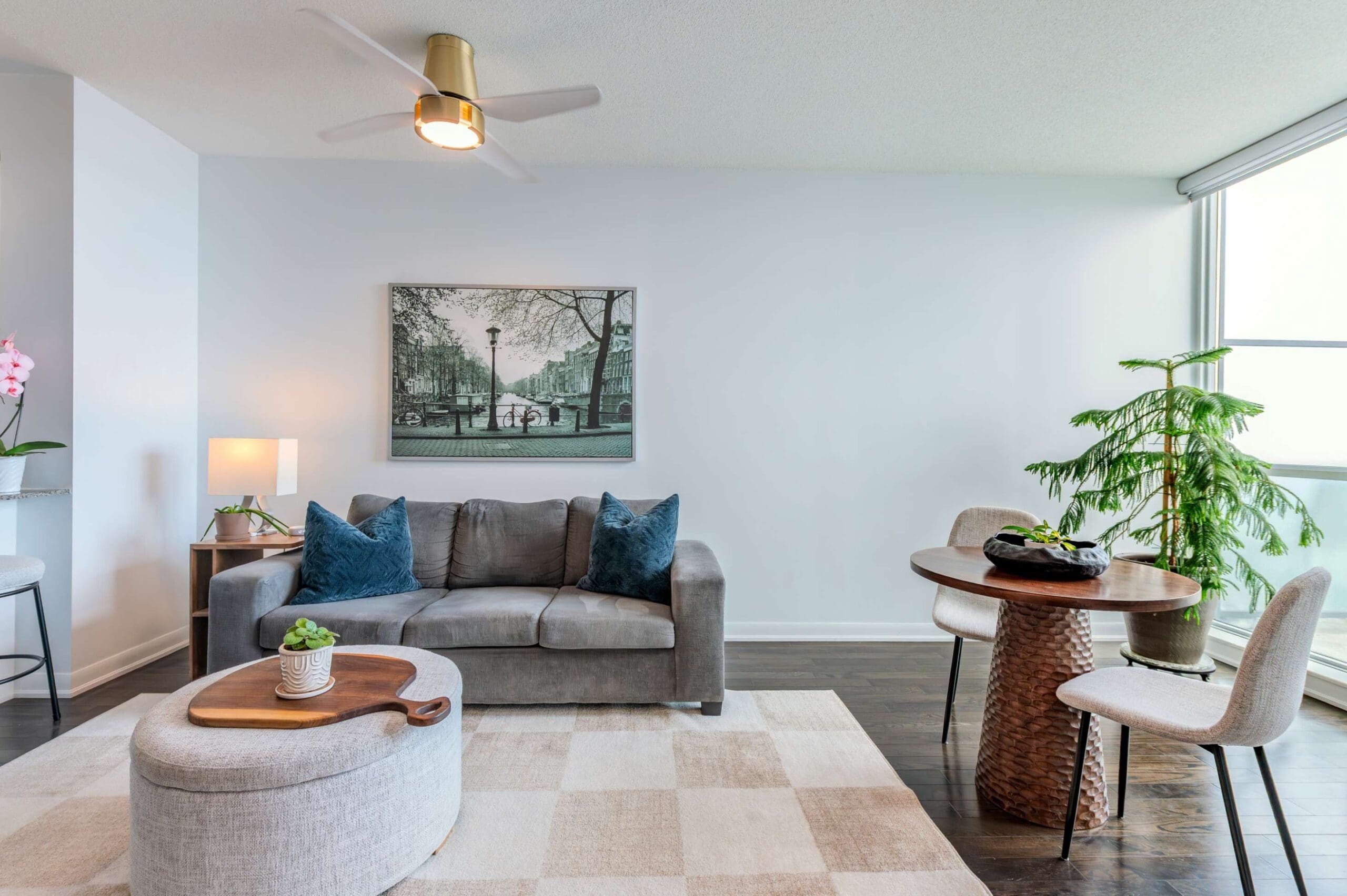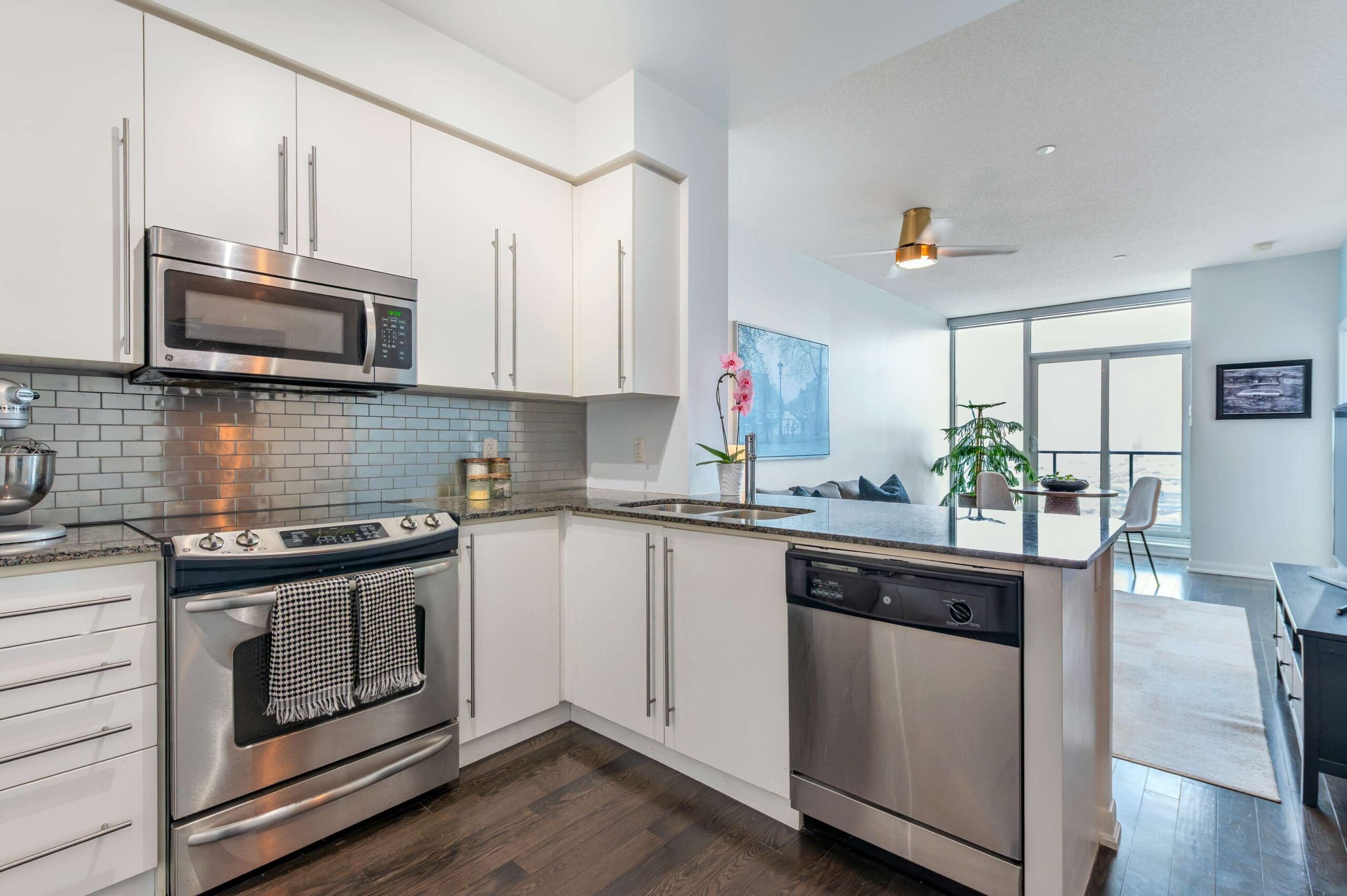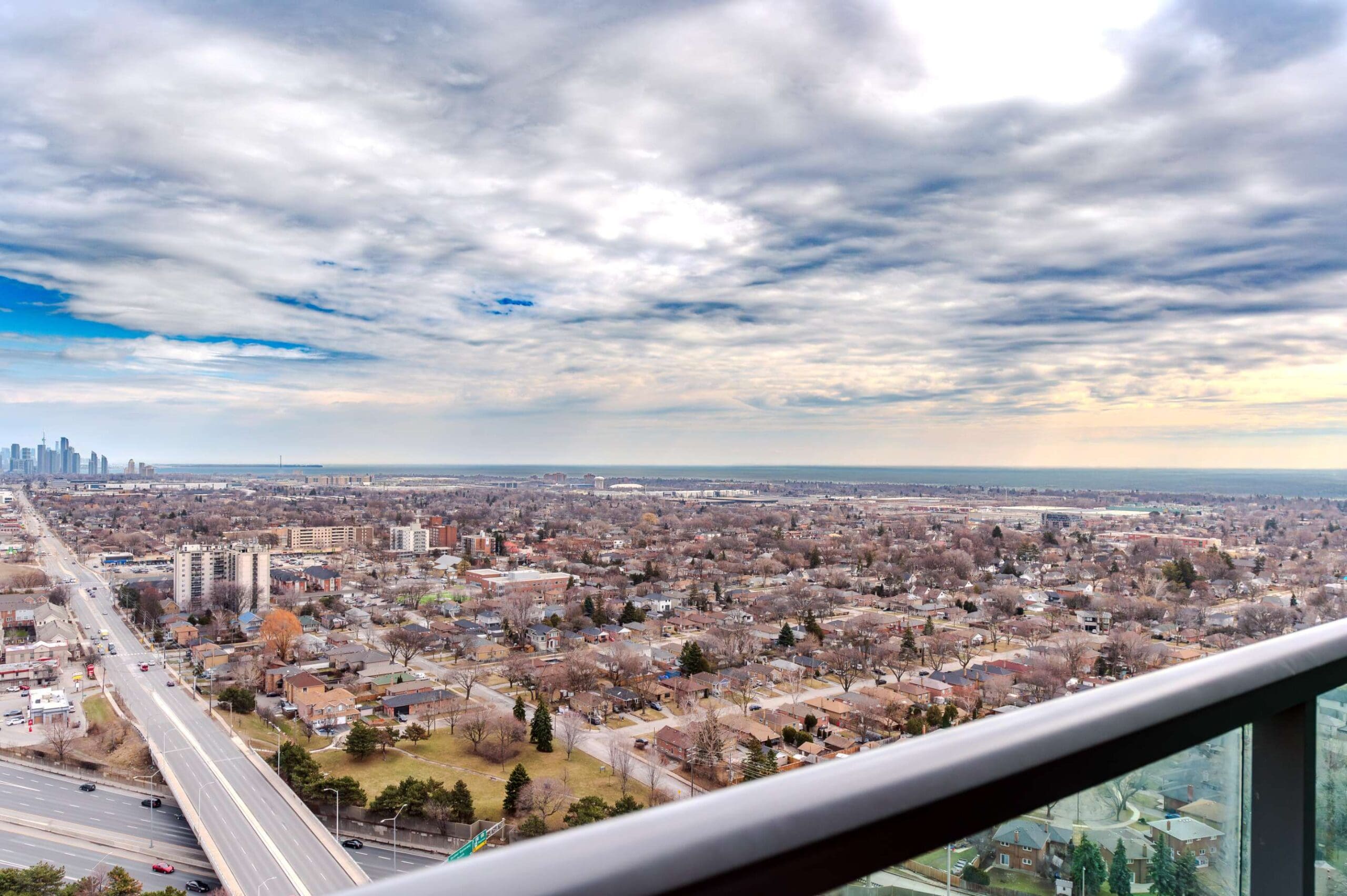 Stop your search, because this is the one you have been waiting for! Penthouse 101 at 215 Sherway Gardens Road is a super sassy one-bedroom plus den retreat that redefines high-floor living with unobstructed, panoramic east views stretching across the city skyline and down to the lake! The interior vibe is elevated by soaring 9′ ceilings, floor-to-ceiling windows that drench the space in natural light, and sleek engineered hardwood floors. Function meets style in the eat-in kitchen, which boasts stainless steel appliances, granite counters, a breakfast bar, and an impressive amount of storage for the home chef.