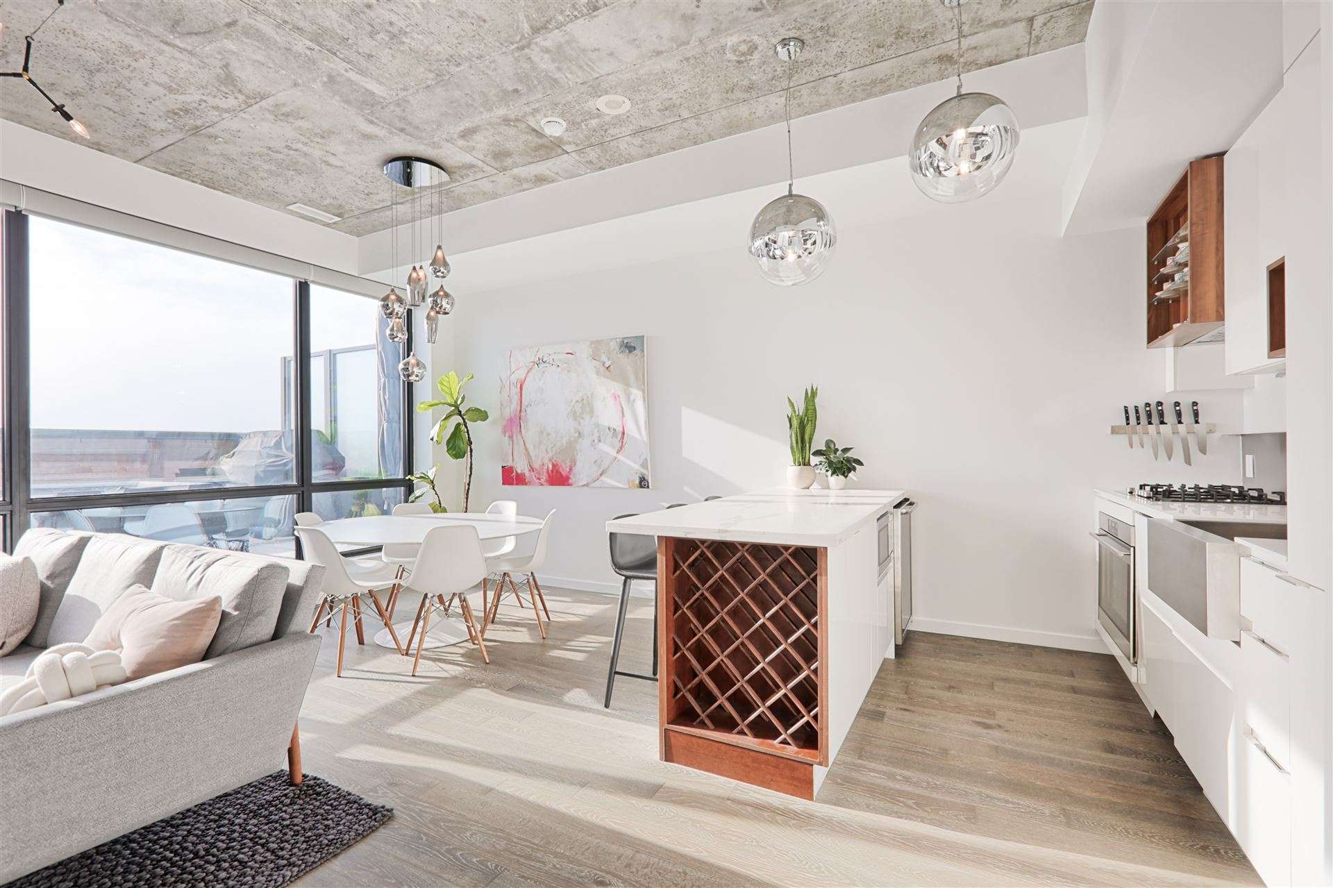 Spectacular 2-storey penthouse with unmatched south views in coveted Roncesvalles Village! Experience the epitome of urban luxury in this stunning 2-storey penthouse condominium, offering 2 bedrooms plus a den/office and 2 beautifully appointed washrooms. Perfectly designed for modern living, this home boasts an open-concept main floor with soaring 10-foot exposed concrete ceilings and engineered hardwood floors throughout. The primary bedroom features a generous walk-in closet and a luxurious 3-piece ensuite bath, while the den offers the perfect space for a home office or additional lounge area. The chef’s kitchen is a showstopper with a breakfast bar, integrated appliances, a beverage fridge, and a sleek stainless steel backsplash. Step outside onto the fabulous and spacious terrace, complete with a gas hookup for barbecues and breathtaking, unobstructed views of the water, the CN Tower, and the Toronto skyline. It’s the perfect spot to entertain or unwind after a long day. Located in a pet-friendly building close to parks, shopping, and all the amenities you could need, with parking and extra storage, this penthouse combines luxury, convenience, and an unbeatable location.