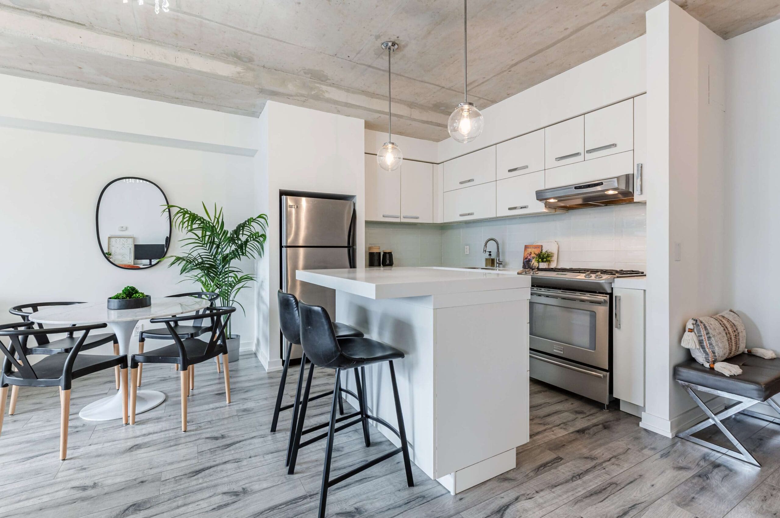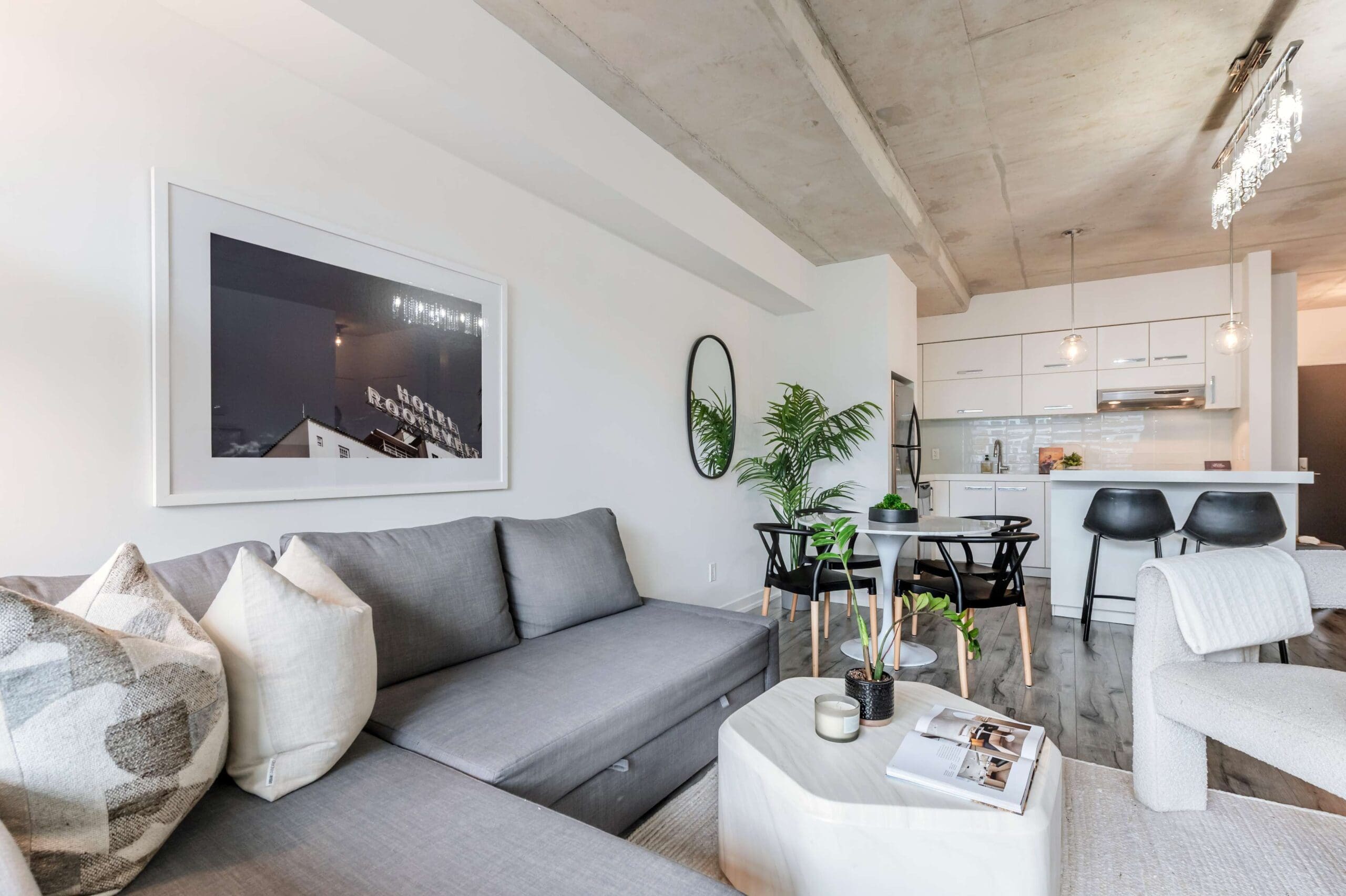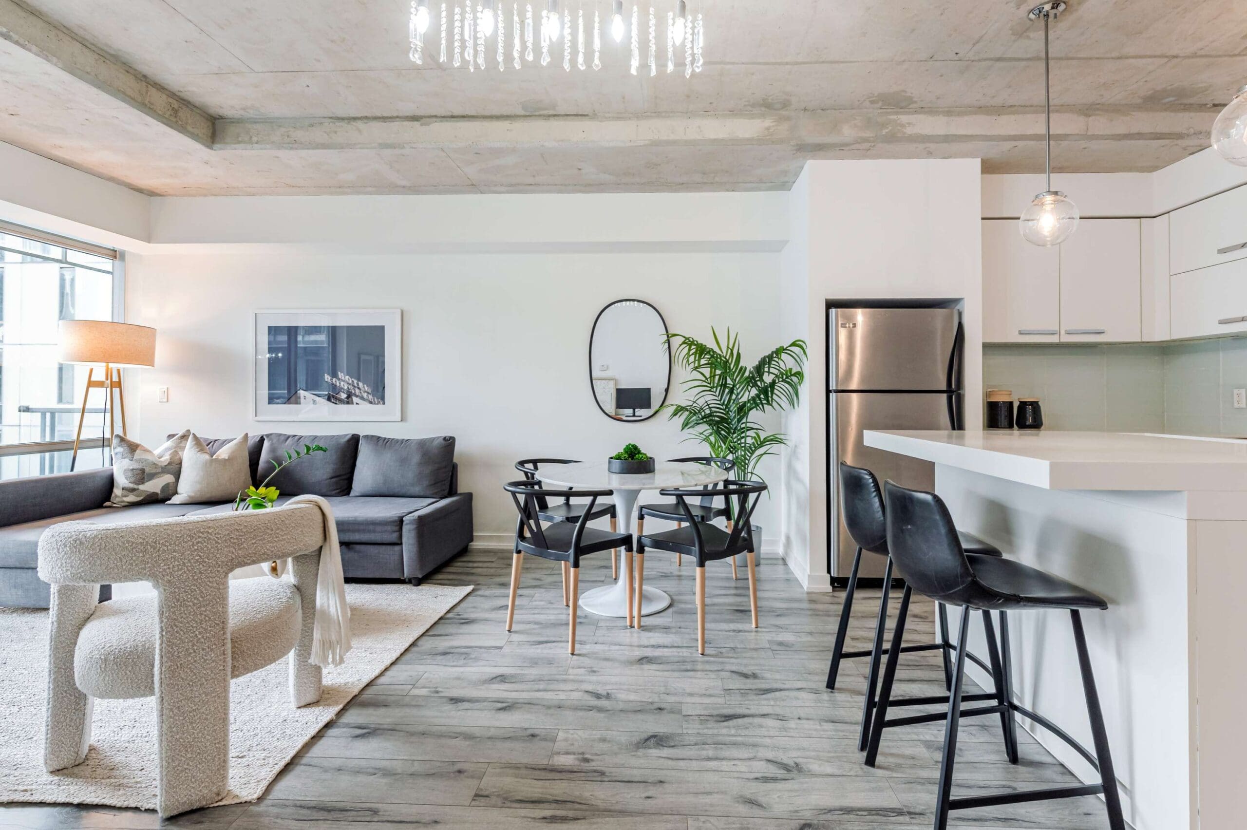 Experience the pinnacle of urban sophistication at the prestigious 1 Hotel Residences. Unit 703 is a spotless and spacious one-bedroom suite that perfectly balances industrial chic with modern luxury. The interior boasts soaring exposed concrete ceilings and wide-planked laminate flooring throughout, illuminated by natural light pouring in through floor-to-ceiling windows. The open-concept living space features a custom-built white wall unit offering oodles of storage, while the kitchen is a chef’s dream, complete with stainless steel appliances and a custom island with a functional breakfast bar.