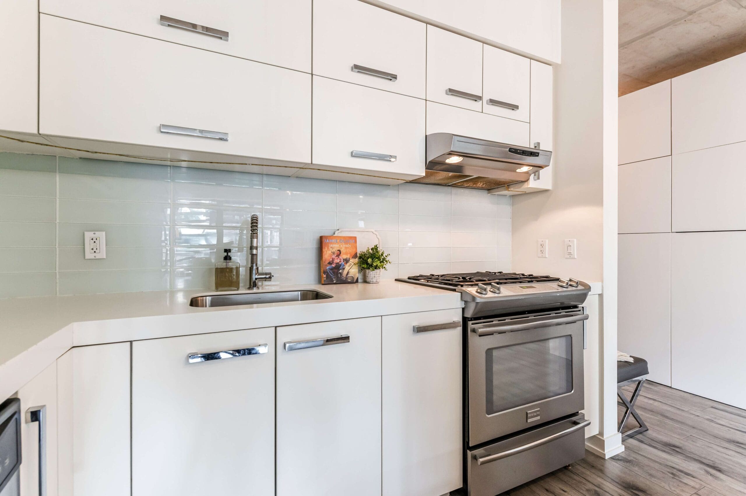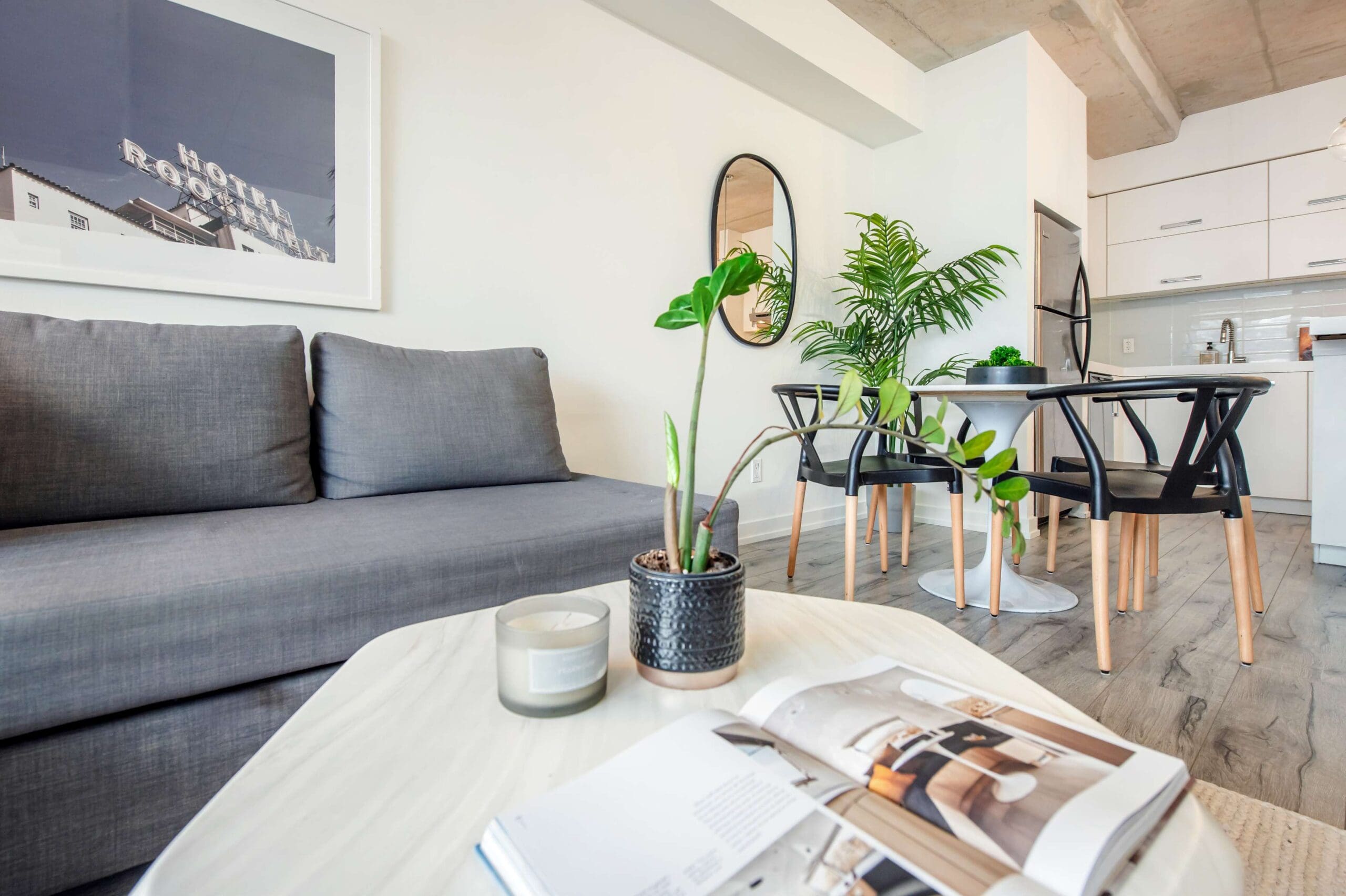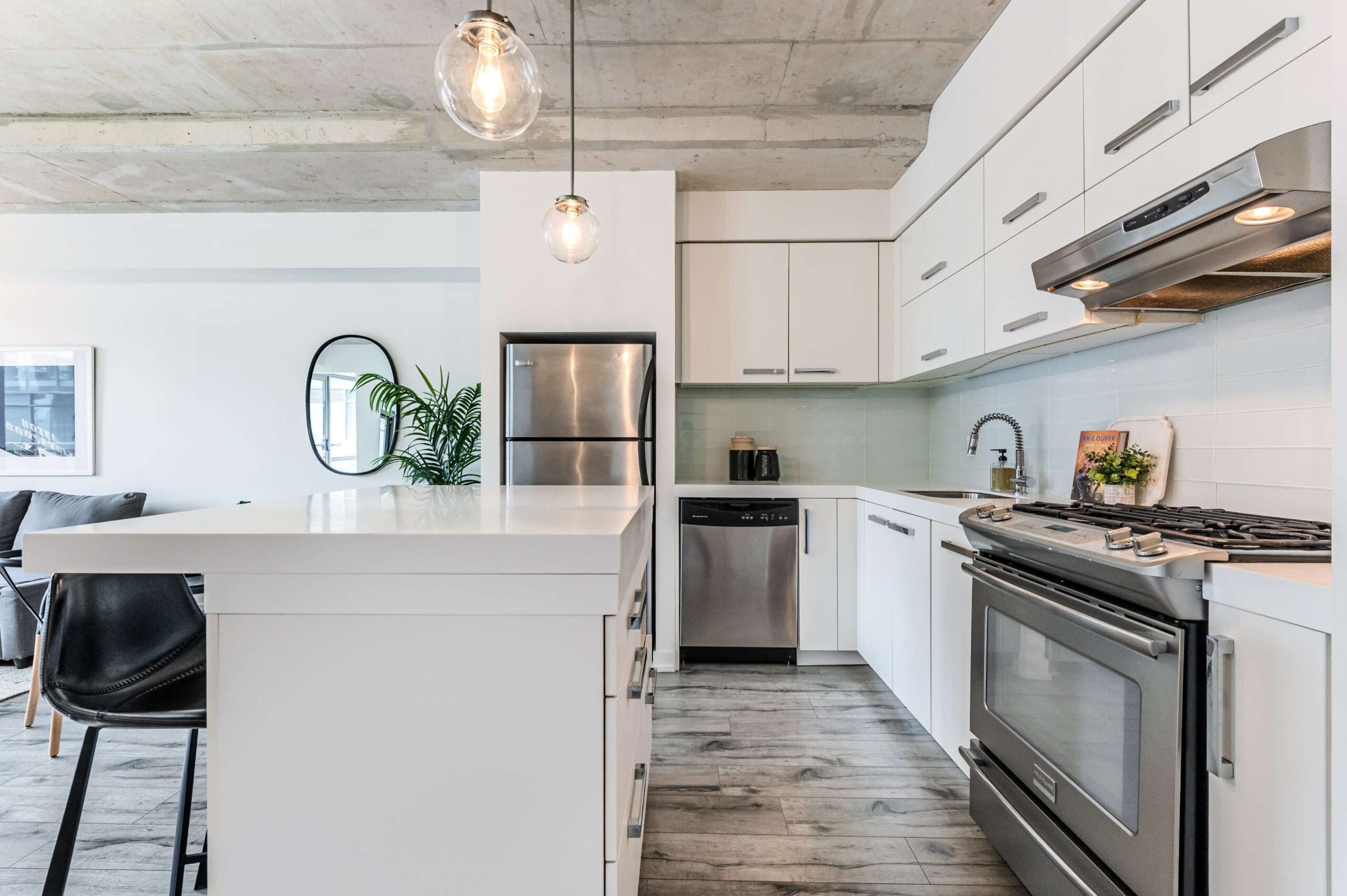 Experience the pinnacle of urban sophistication at the prestigious 1 Hotel Residences. Unit 703 is a spotless and spacious one-bedroom suite that perfectly balances industrial chic with modern luxury. The interior boasts soaring exposed concrete ceilings and wide-planked laminate flooring throughout, illuminated by natural light pouring in through floor-to-ceiling windows. The open-concept living space features a custom-built white wall unit offering oodles of storage, while the kitchen is a chef’s dream, complete with stainless steel appliances and a custom island with a functional breakfast bar.